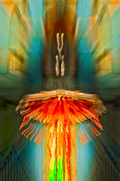 The exploration of colors, shapes, and dynamic beams of light transforms the Sagrada Familia's interior into enigmatic visuals and abstract forms. Radial bursts of light and color redefine the space, where architectural elements seem to dissolve into a fluid, dreamlike dimension.